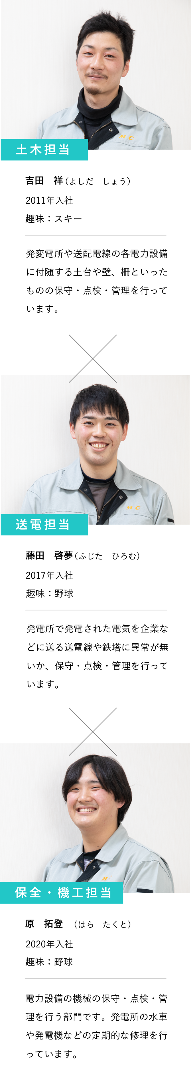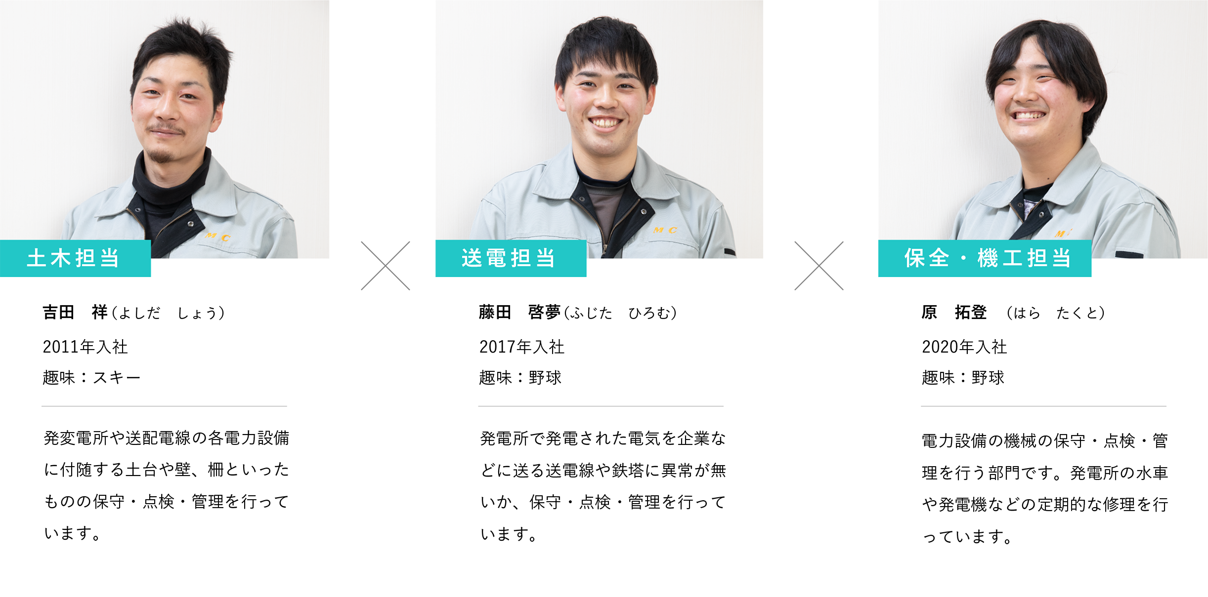 糸魚川特有の地形が生み出す環境に優しい水力発電システムの保守・管理に携わる若手社員3人が集まった。